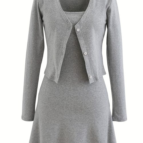 Elegant Solid Two-piece Set, Single Button Outwear & Slim Simple Dress Outfits, Women’s Clothing