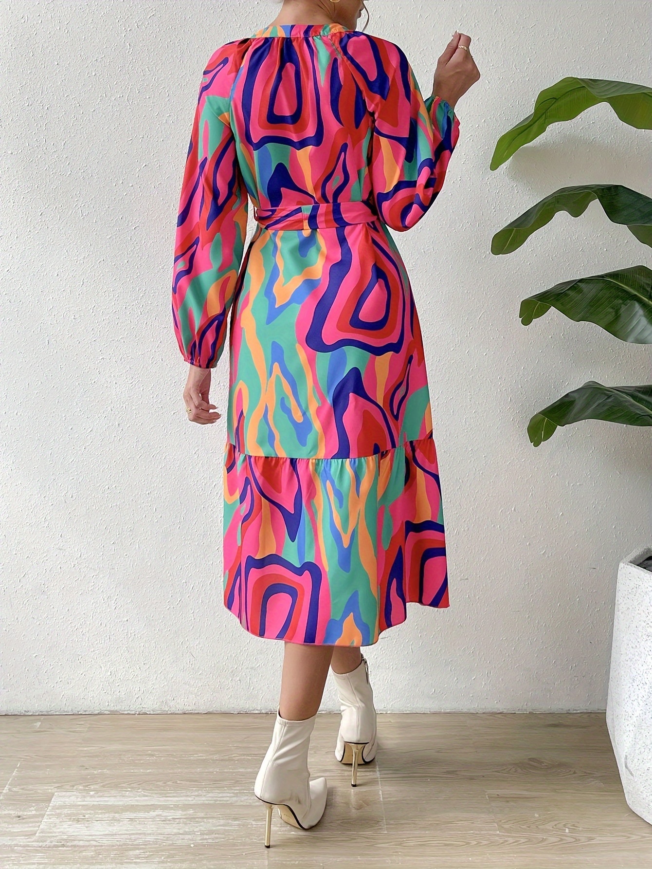 4 reviews for Abstract Print Crew Neck Dress, Elegant Long Sleeve Belted Dress For Spring & Fall, Women’s Clothing