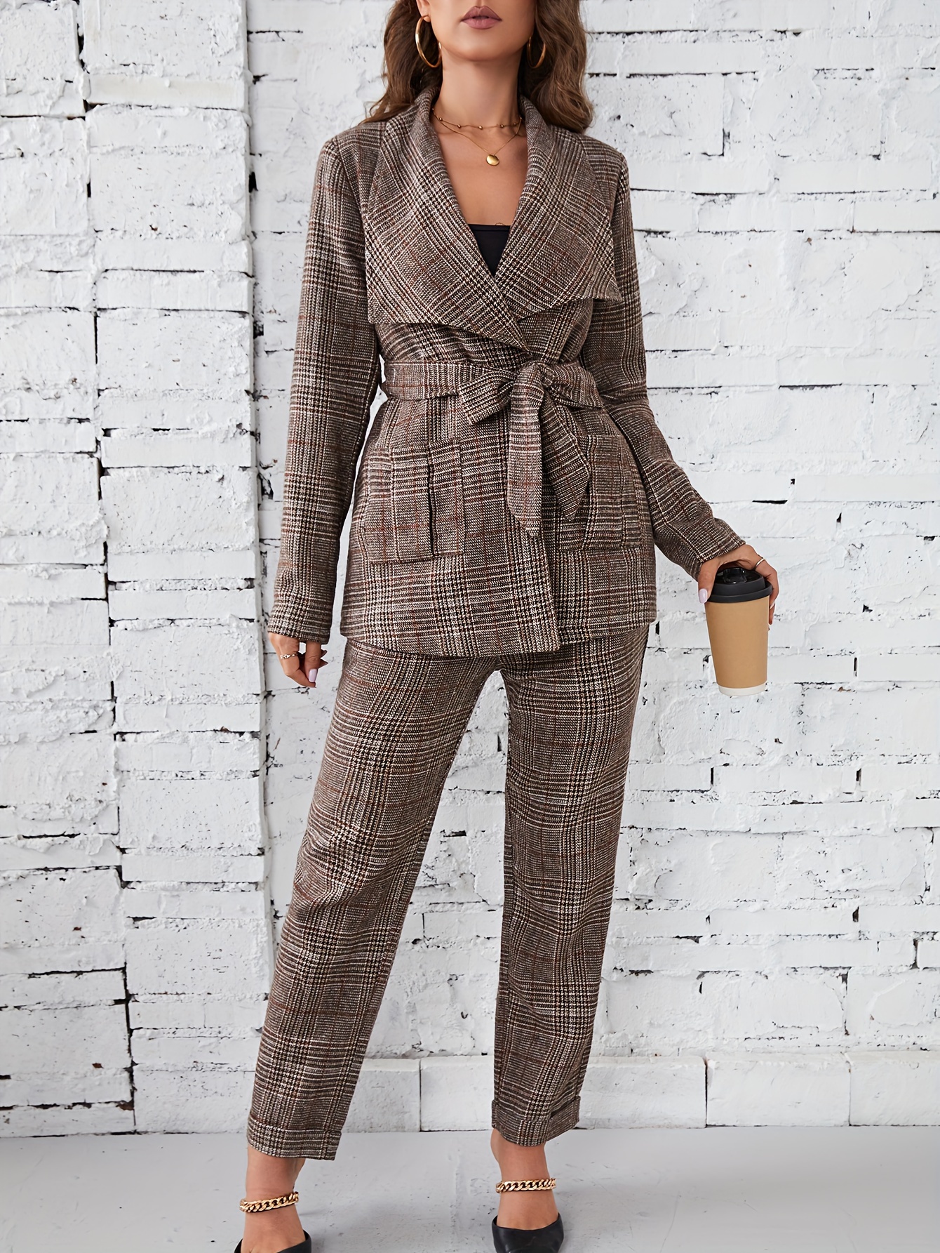 Plaid Pattern Elegant Two-piece Set, Long Sleeve Open Front Tops & Wide Leg Pants Outfits, Women’s Clothing