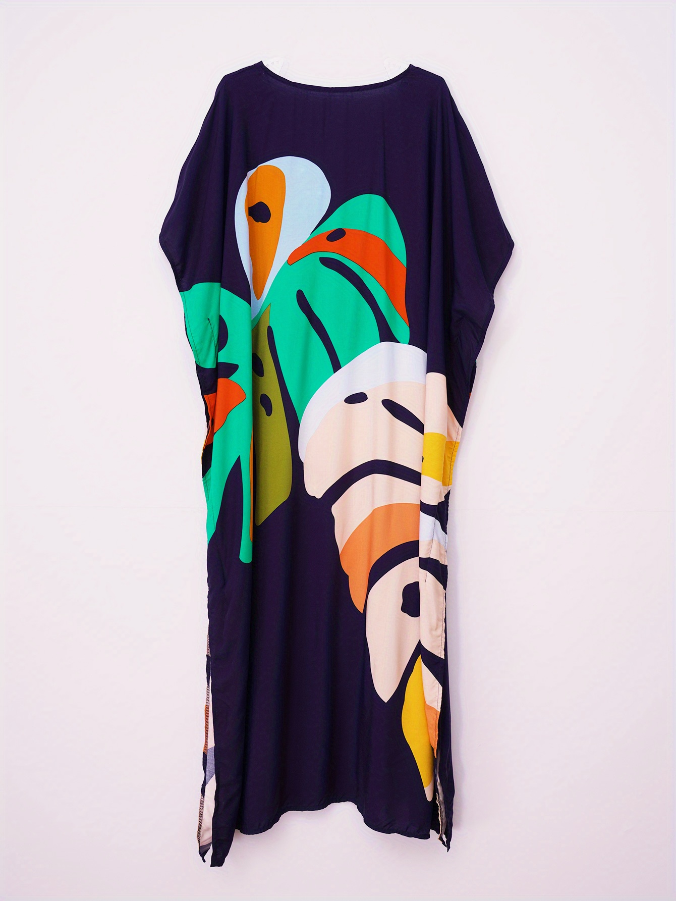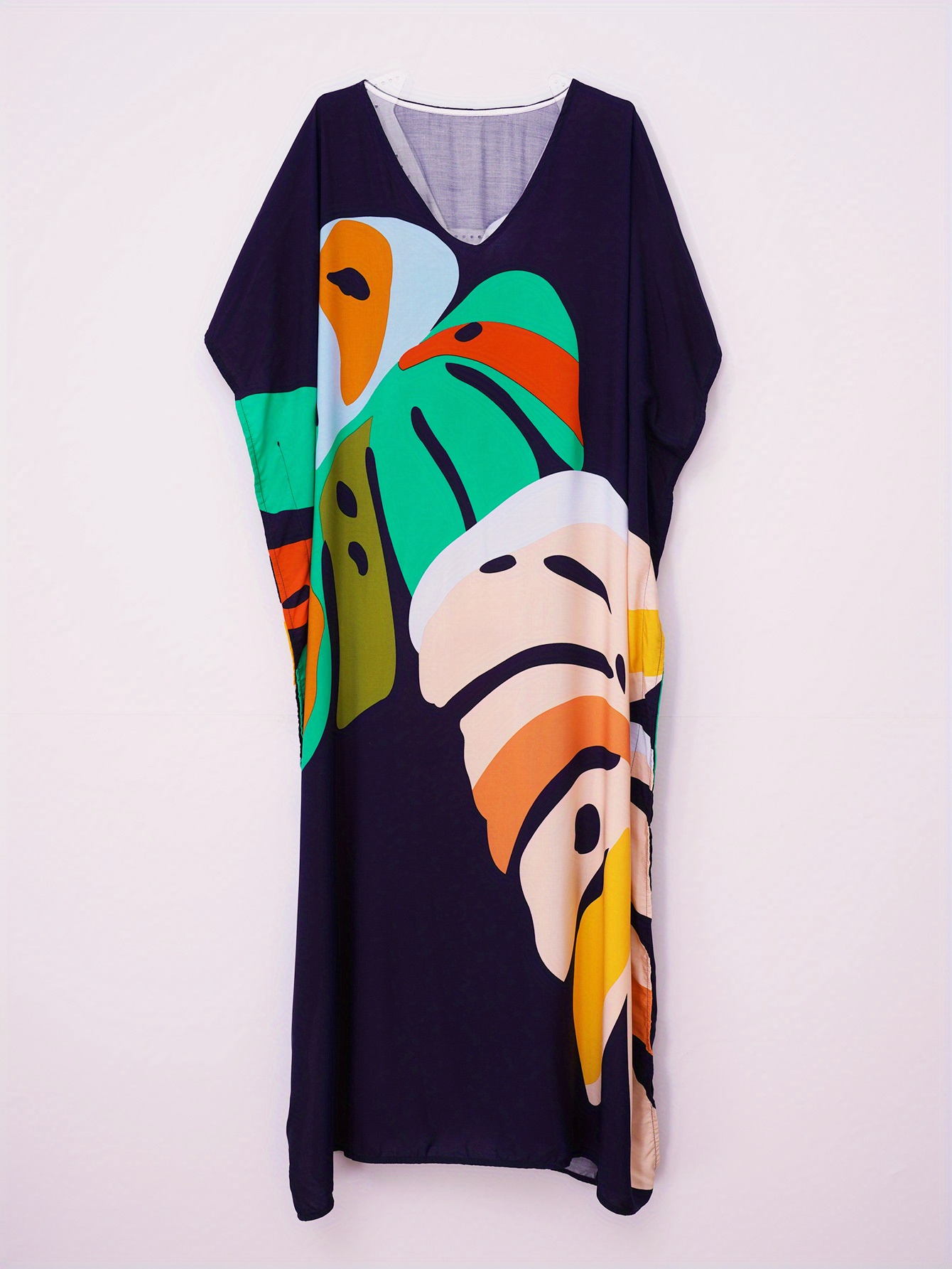 Plus Size Vacay Dress, Women’s Plus Leaf Print Bat Sleeve V Neck Split Hem Cover Up Maxi Dress