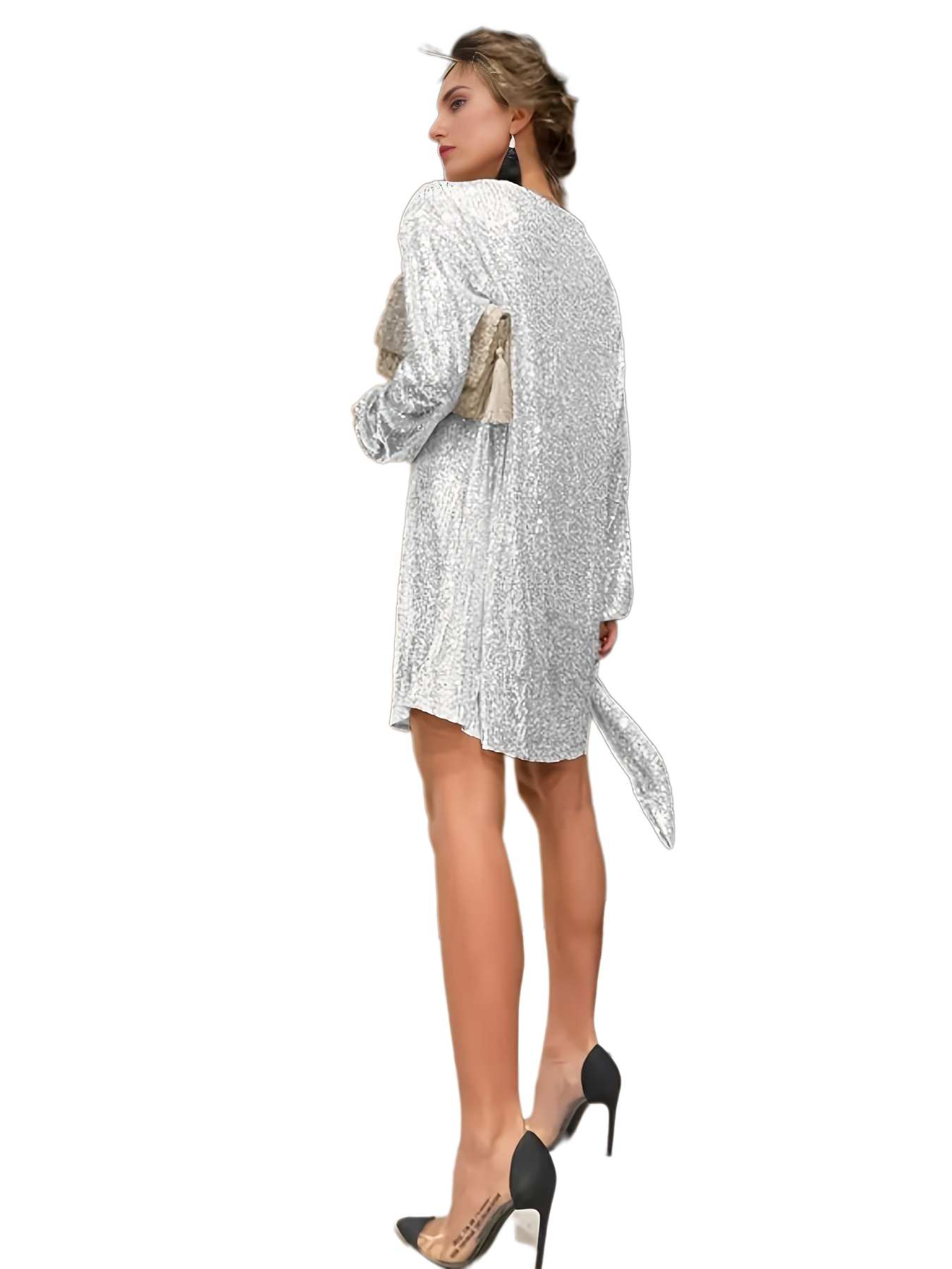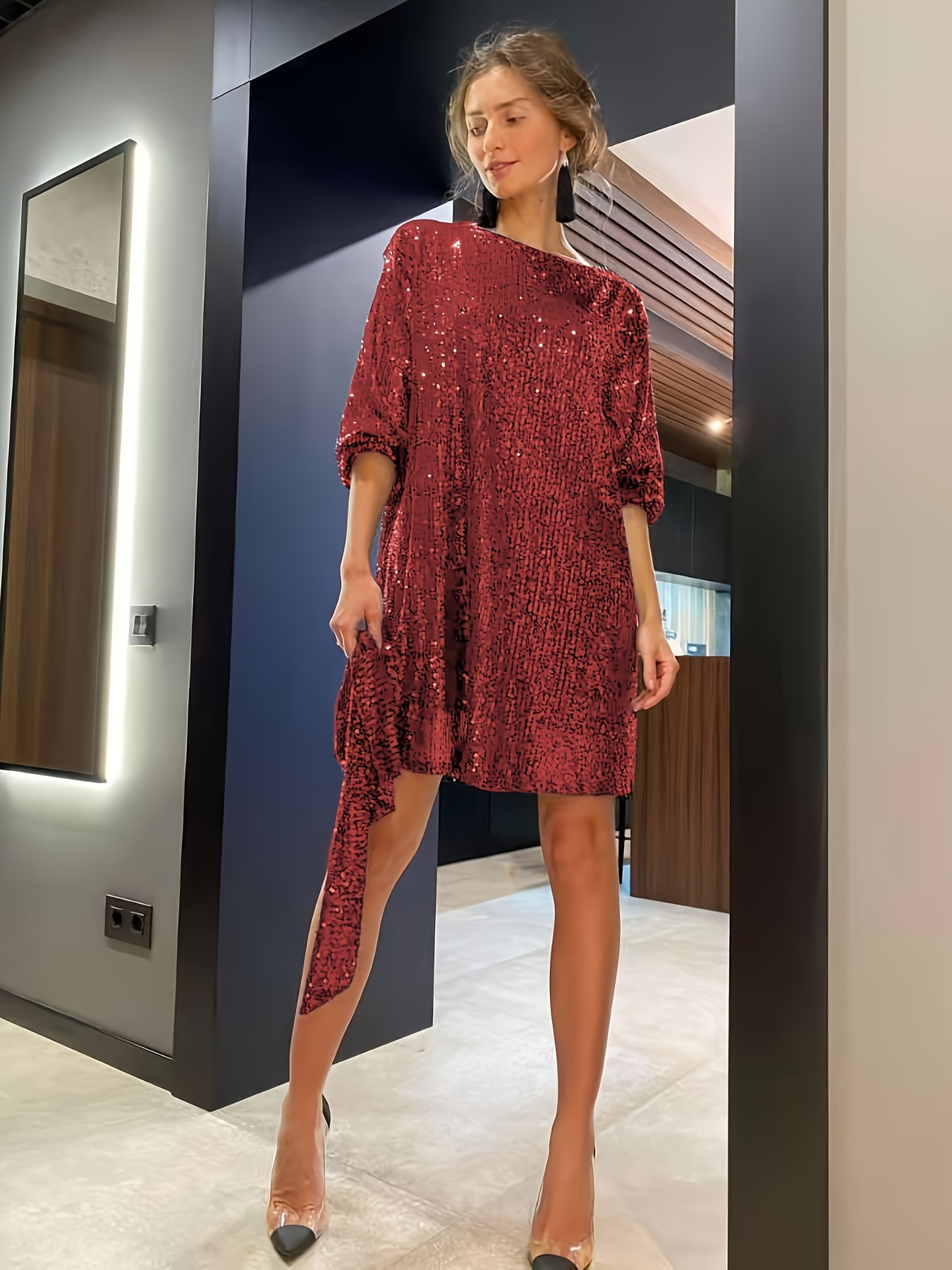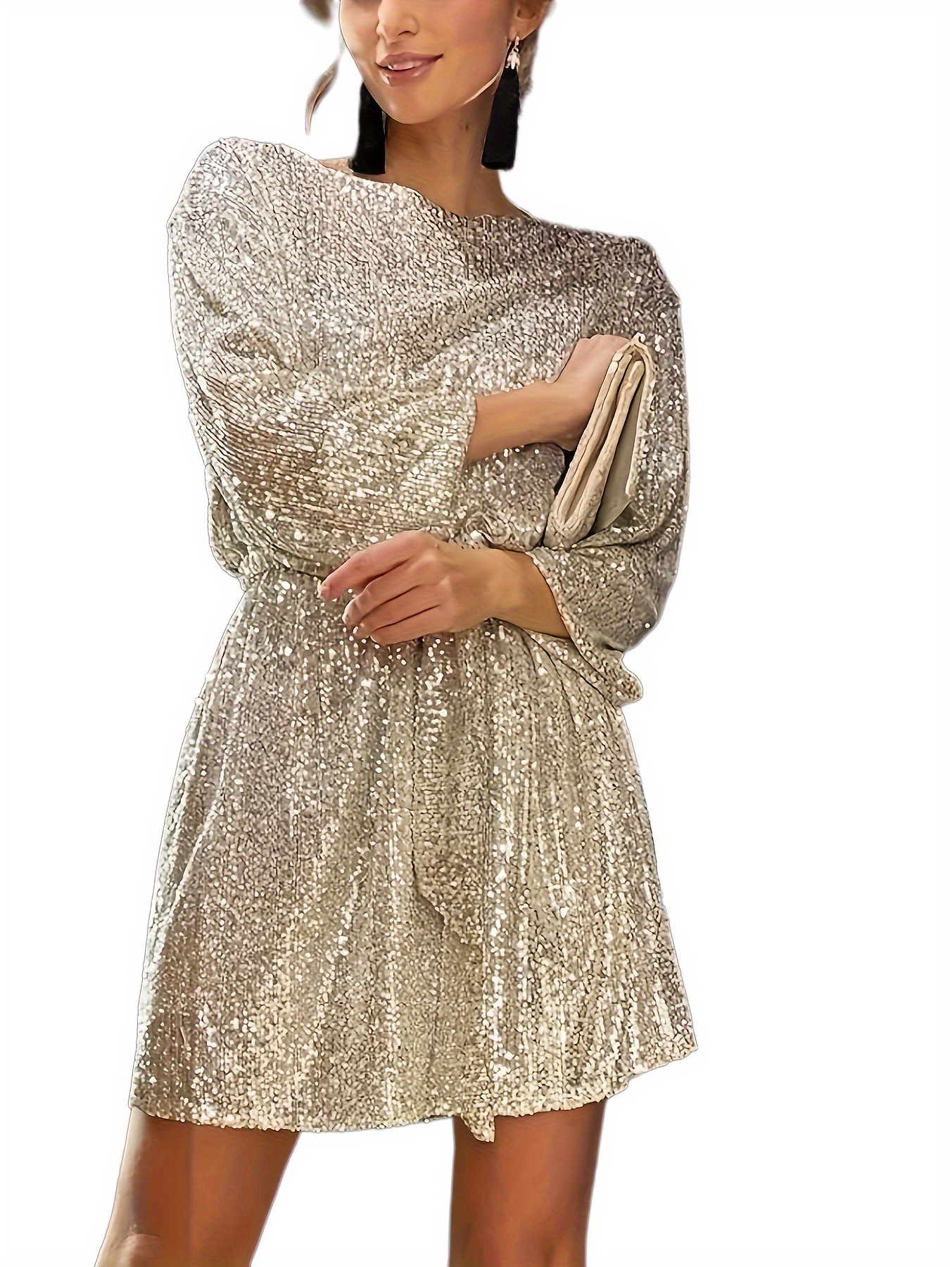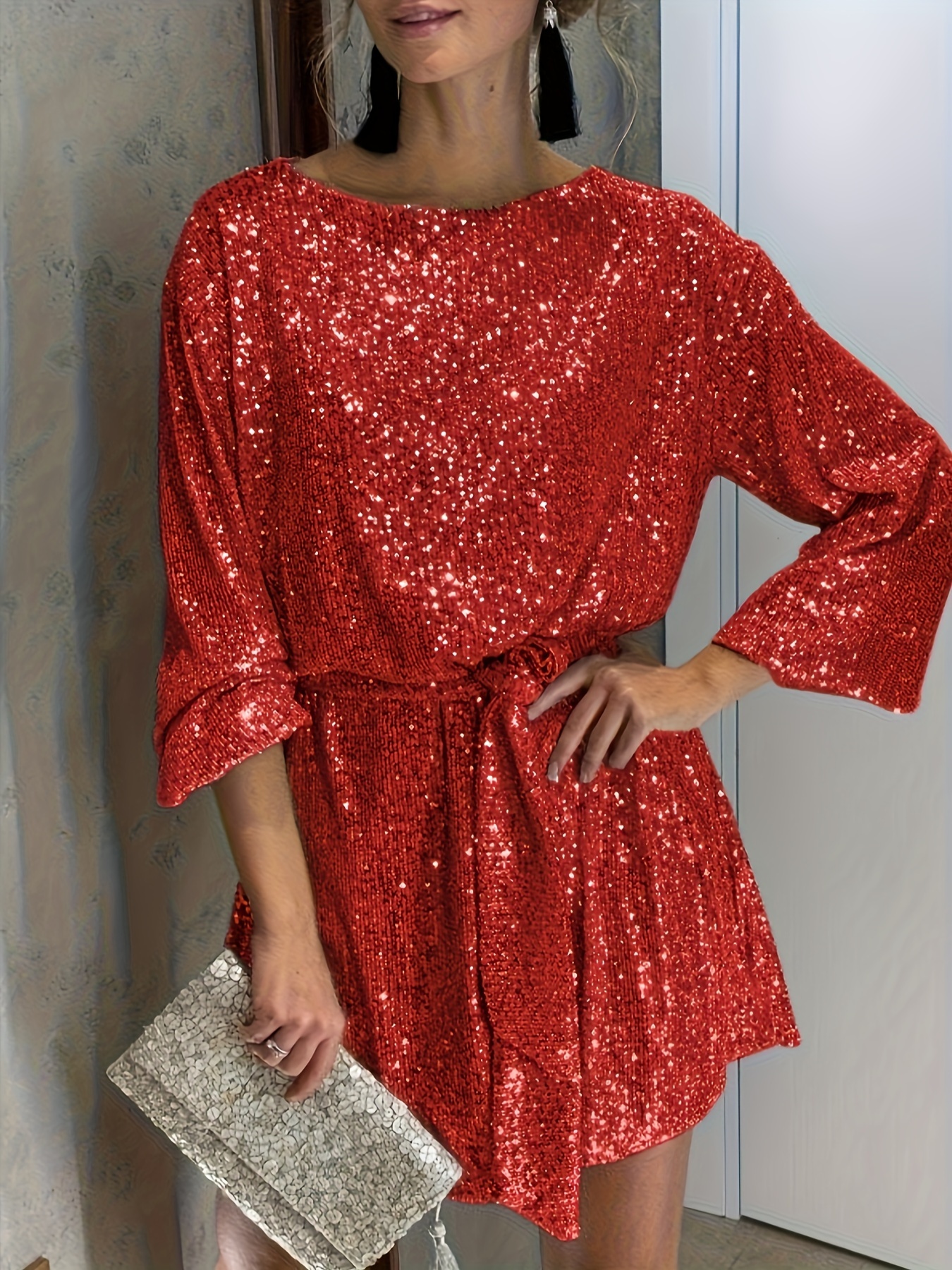 Be the first to review “Sequined Tie Waist Dress, Elegant Solid Dress For Club & Party, Women’s Clothing”