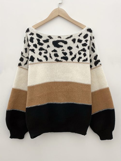 Stylish Color Block Leopard Print Sweater, Crew Neck Long Sleeve Sweater, Casual Tops For Fall & Winter, Women’s Clothing